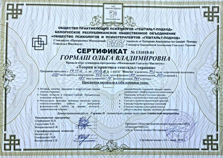 Основы гештальт-терапии Выдан: Институт Гештальта (Минск, Беларусь)