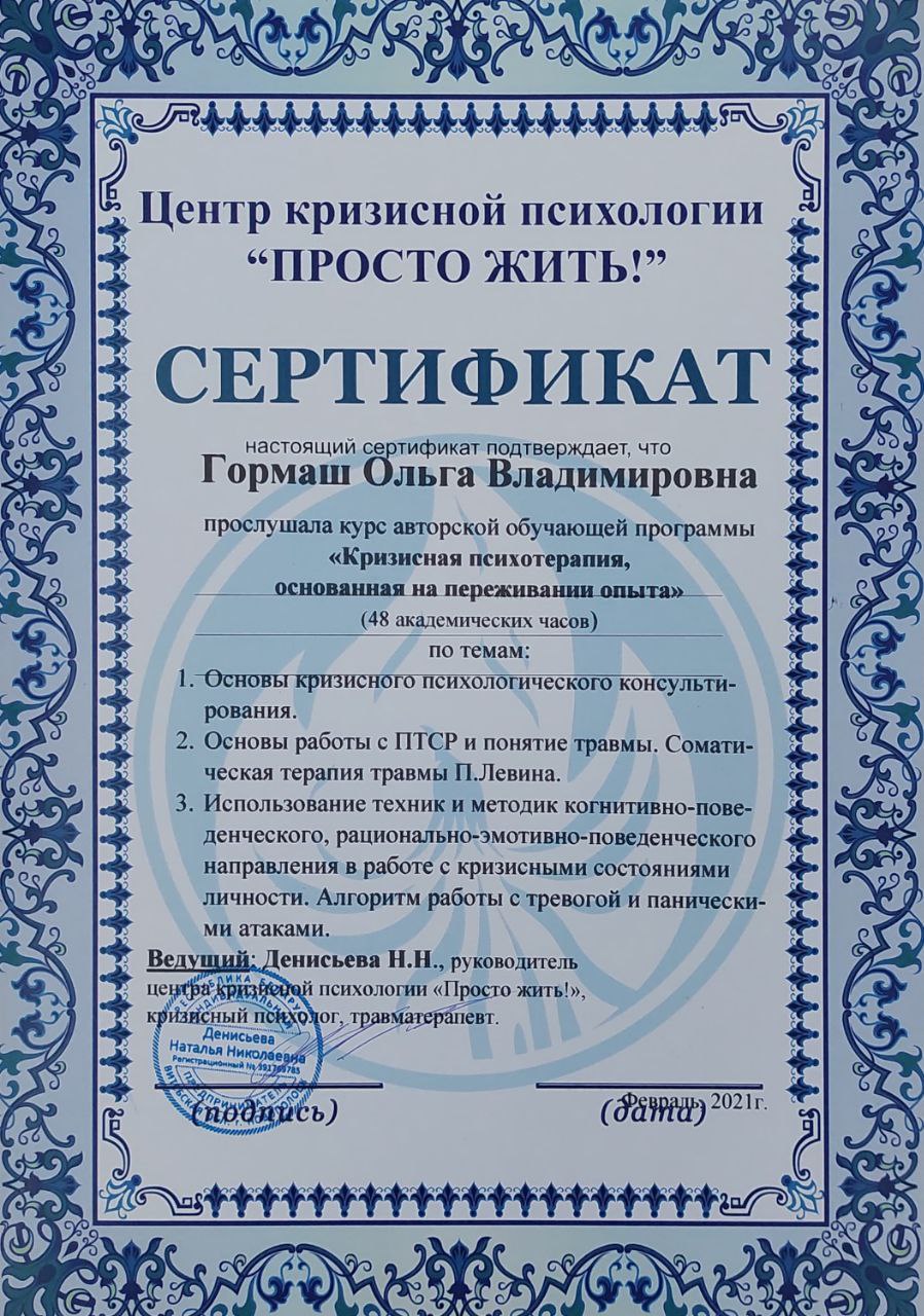 Кризисная психотерапия основанная на переживании опыта Выдан: Центр кризисной психологии Просто жить