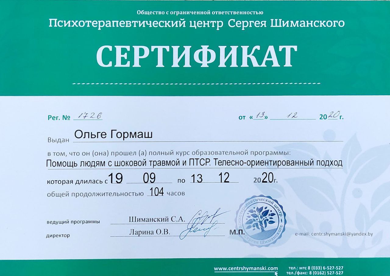Помошь людям с шоковой травмой и ПТСР. Телесно-ориентированный подход Выдан: ООО пстхотерапевтический центр Сергея Шиманского