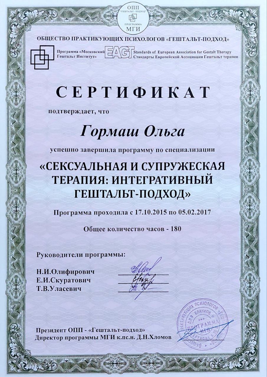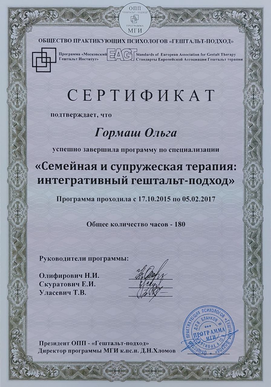 программа по специализации "Семейная и супружеская терапия: интегративный гештальт подход" Выдан: ОПП "Гештальт подход"