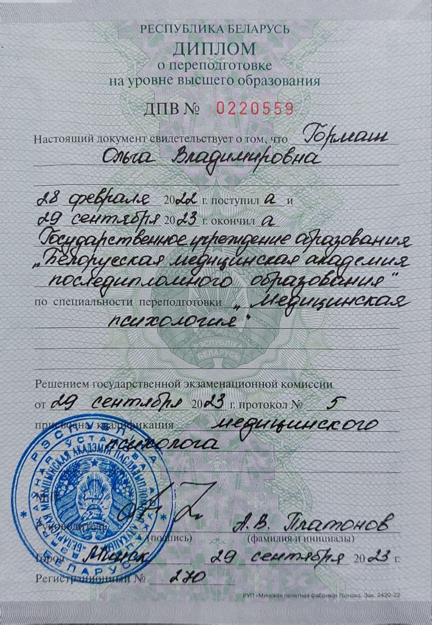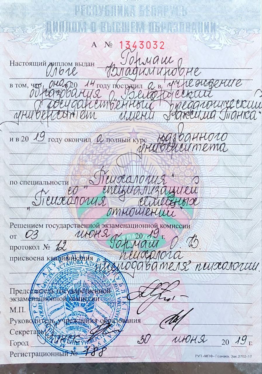 Блорусский Государственный Педагогический Университет им. М.Танка Специальность: Психология семейных отношений Квалификация: психолог, преподаватель психологии Годы обучения: 2014 - 2019