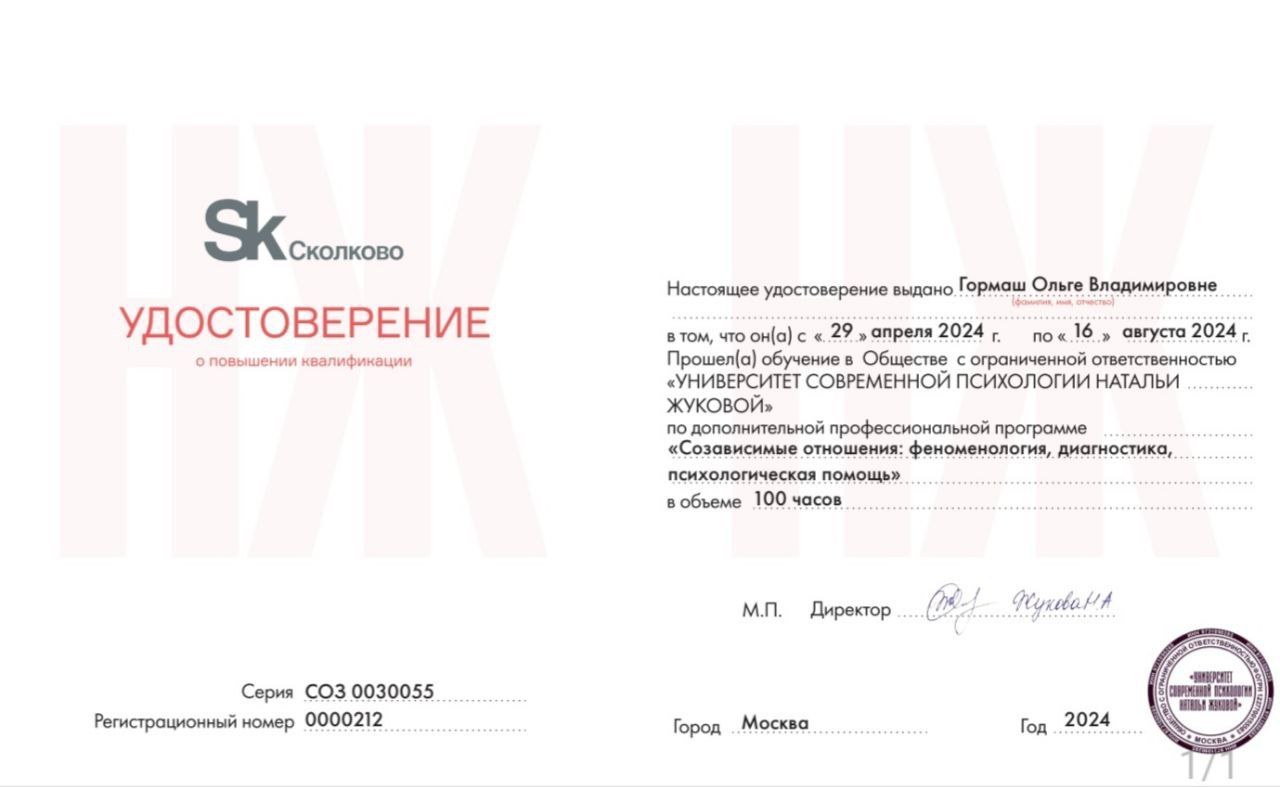 Созависимые отношения: феноменология, диагностика, психологическая помощь. Выдан: Университет современной психологии Н.Жуковой
