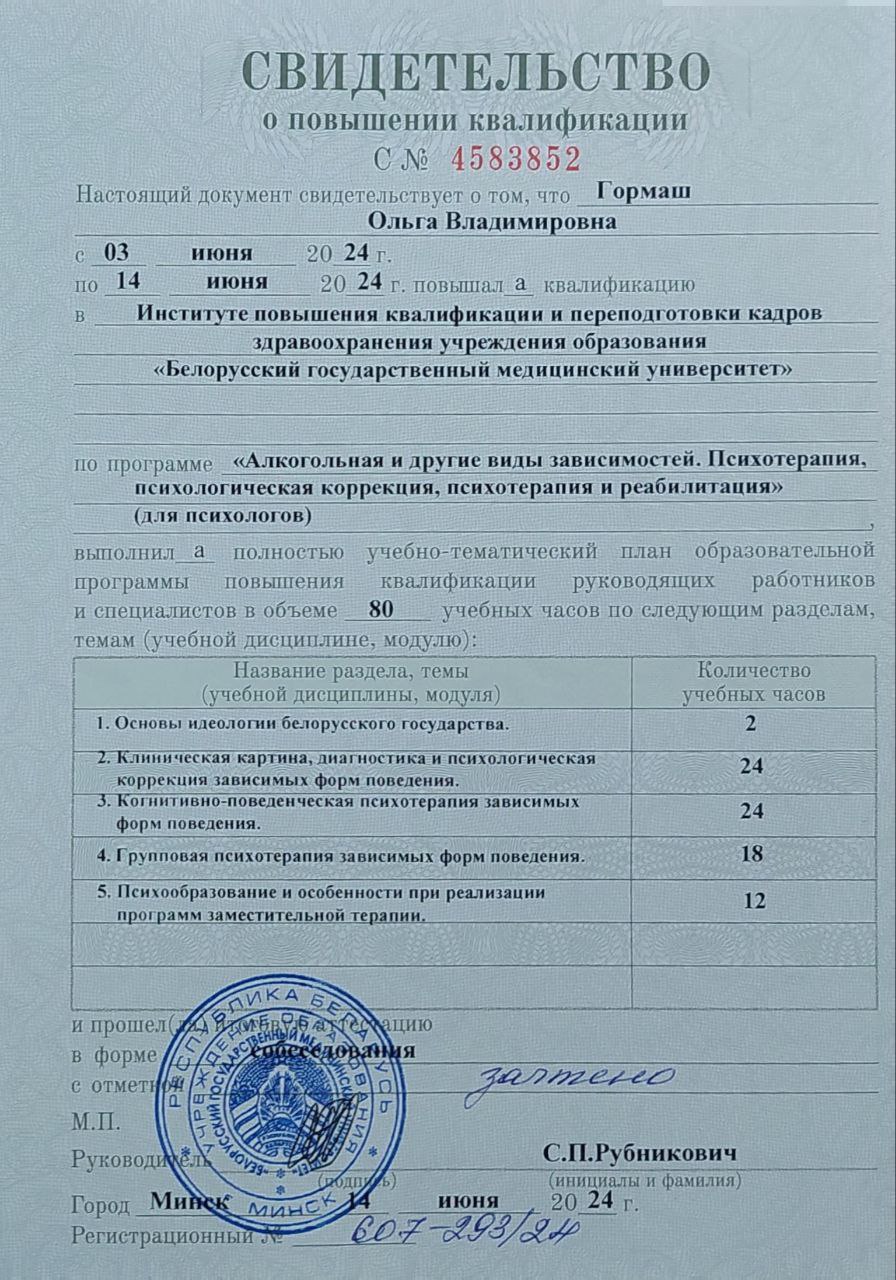 лкогольная и другие виды зависимостей. Психотерапия, психокоррекция и реабилитация. (Для психологов) Выдан: Институт повышения квалификации и переподготовки кадров здравоохранения УО БГМУ Продолжительность: 80 часов