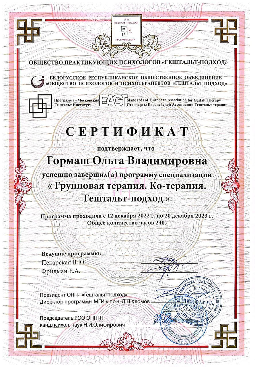 Групповая терапия. Ко-терария. Гештальт подход. Выдан: ОПП гештальт подход Продолжительность: 240 часов Год получения: 2023