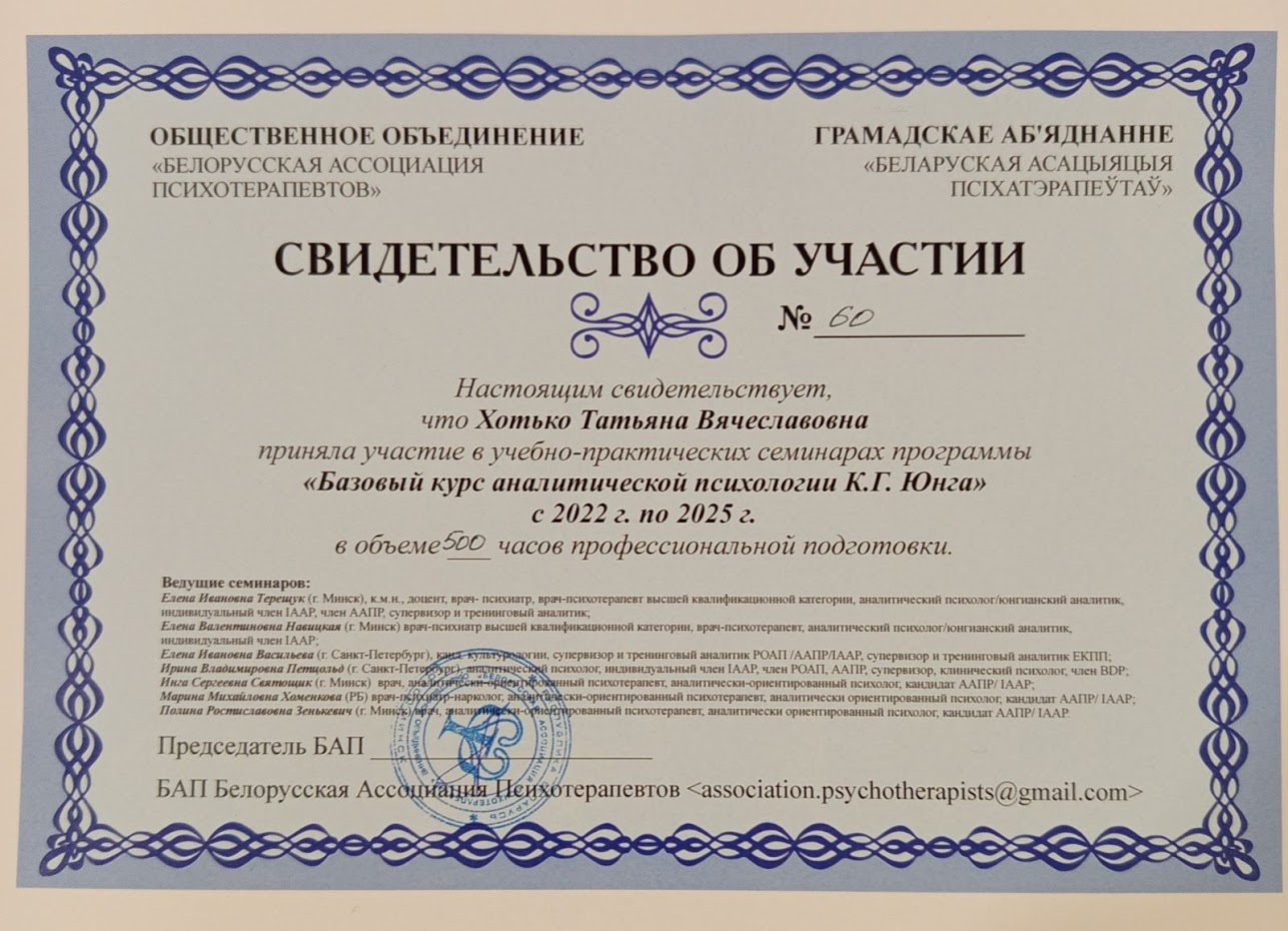 Меня зовут Татьяна, я аналитический психолог. Имею высшее психологическое образование, также обучалась аналитической психологии К.Г. Юнга и проходила различные курсы повышения квалификации. Практикую уже более 10 лет. Мой подход предполагает достаточно глубинную работу с внутренним миром клиента, это работа с комплексами, внутриличностными конфликтами, привычными паттернами поведения, личными границами, отношениями с собой и с миром в целом.